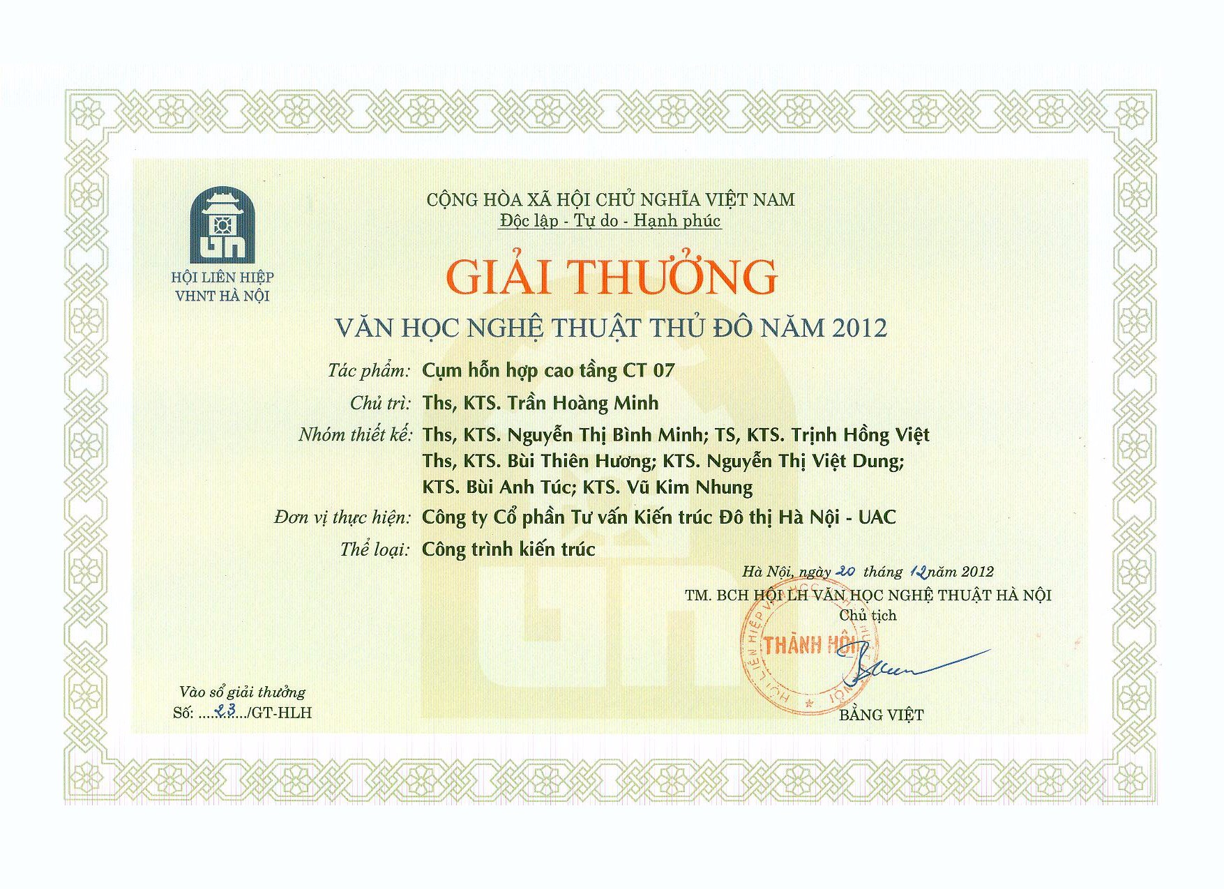 Tổ chức / đơn vị trao giải thưởng: Hội liên hiệp Văn học nghệ thuật thủ đô